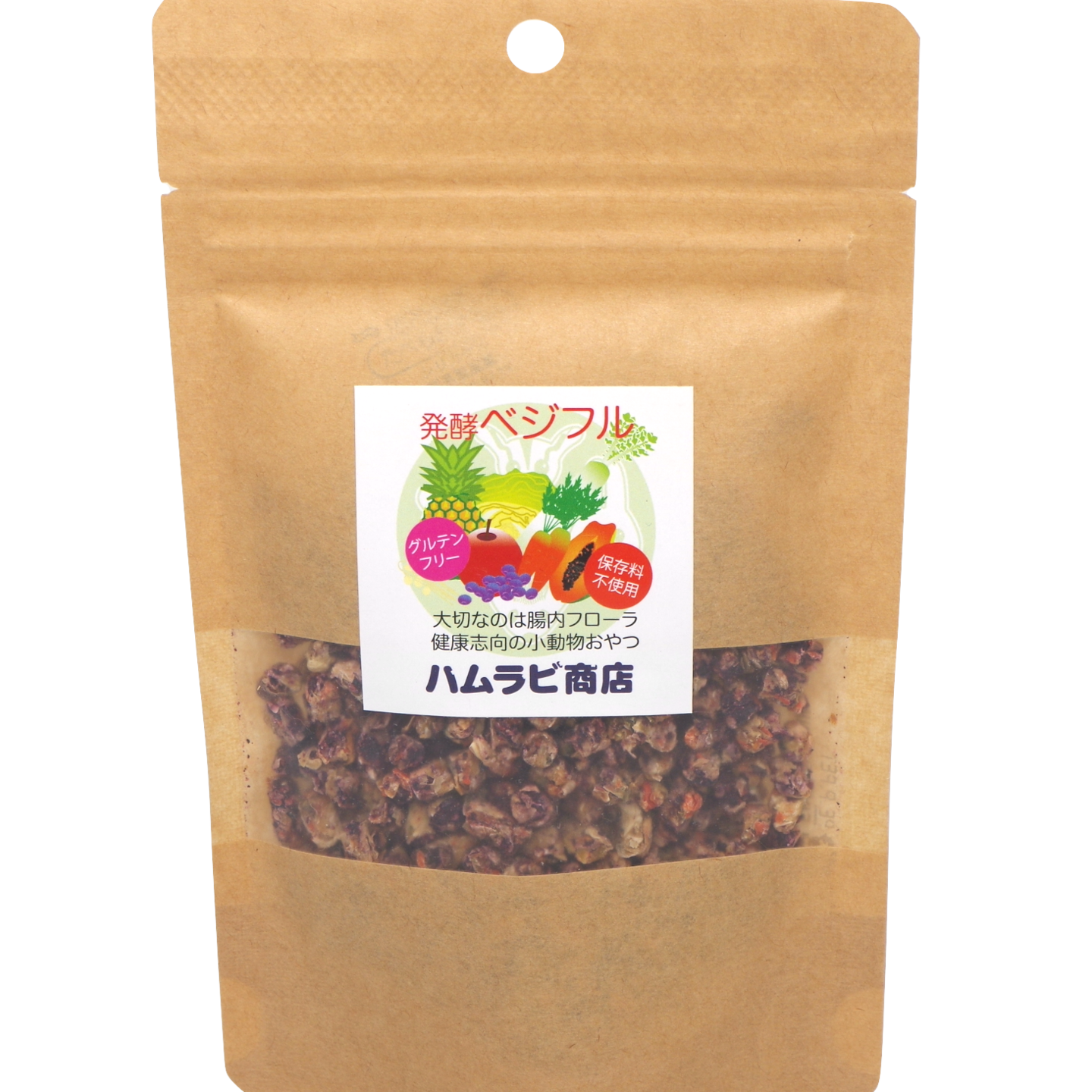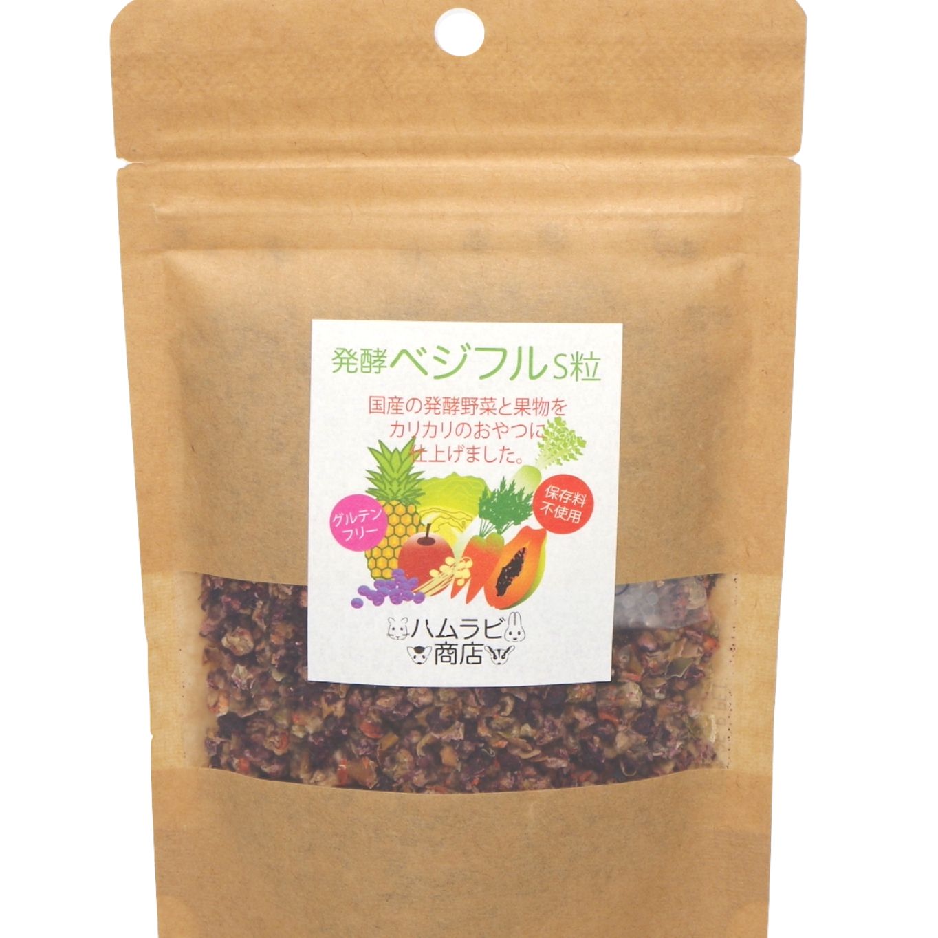 小動物が好む野菜とフルーツで構成されており、幅広い栄養が含まれています。こちらは通常粒サイズです。(別にジャンガリアンハムスターなどの小型種に最適な発酵ベジフルS粒もご用意しております。)